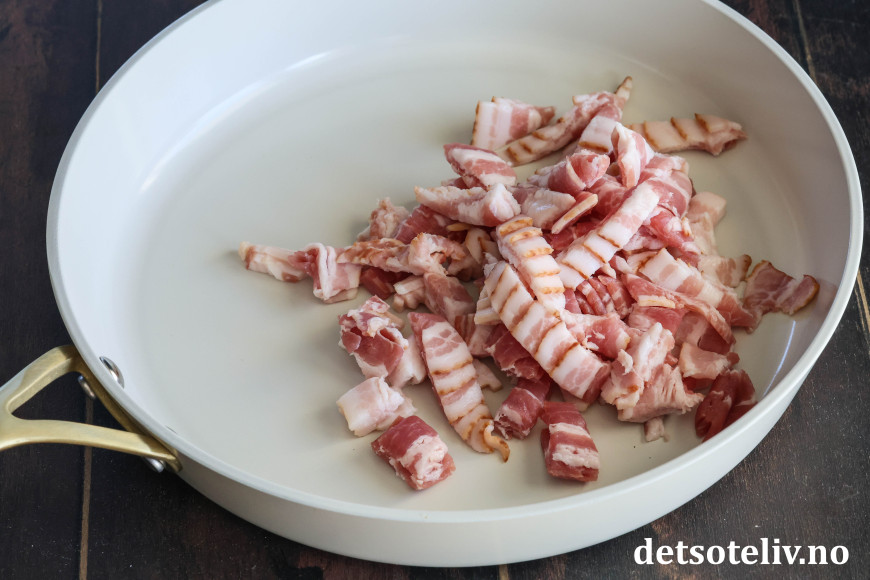 Skjær bacon i små biter og ha dem i en stekepanne.