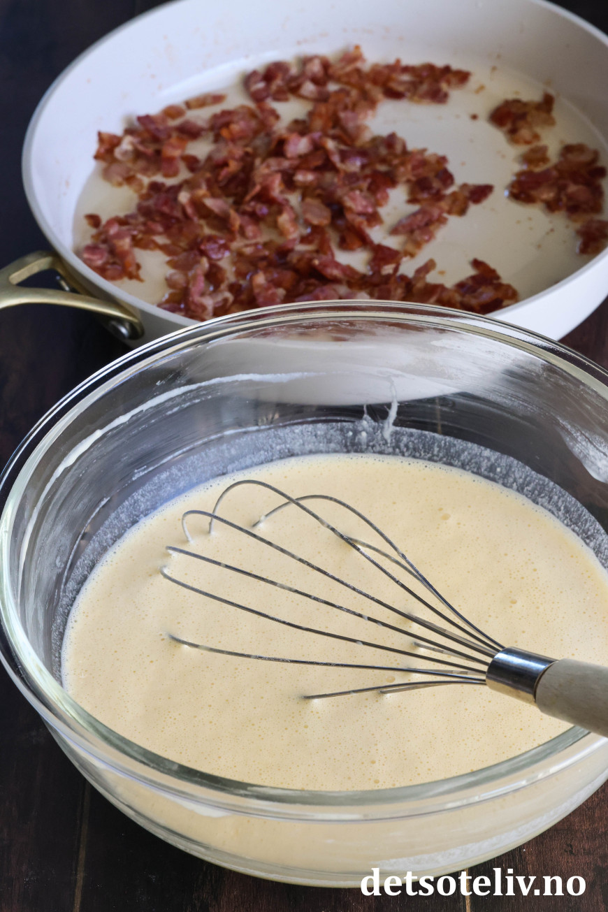 Baconfettet settes til side i en annen skål og kan brukes til steking av pannekakene.