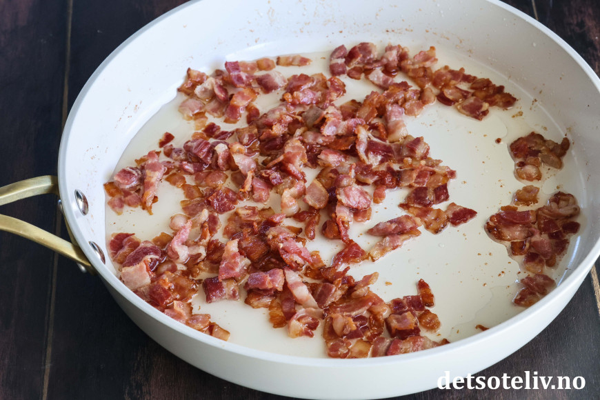 Skjær bacon i små biter og ha dem i en stekepanne. Stek baconet på middels varme slik at det blir sprøtt og fettet smelter.