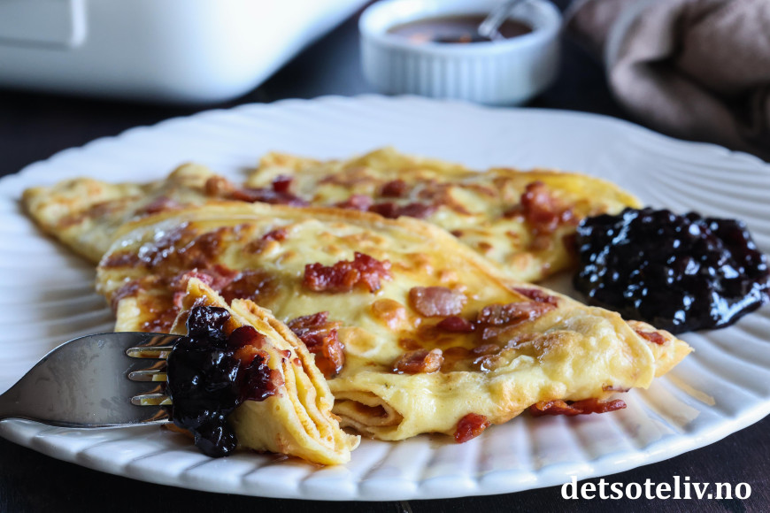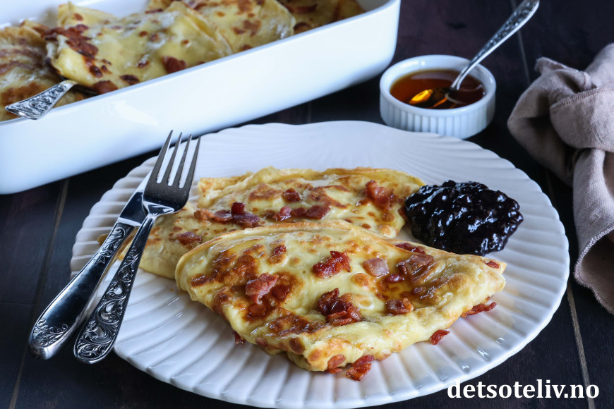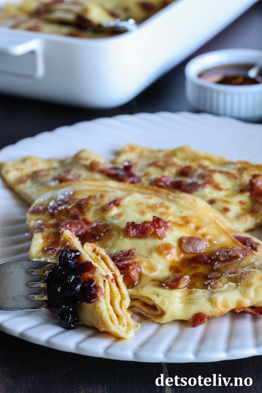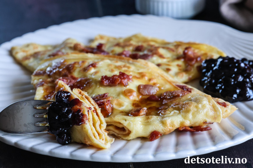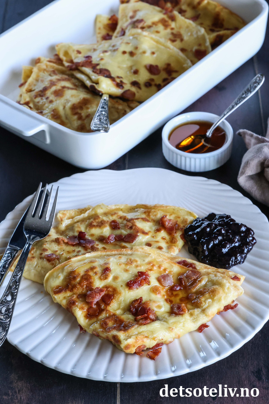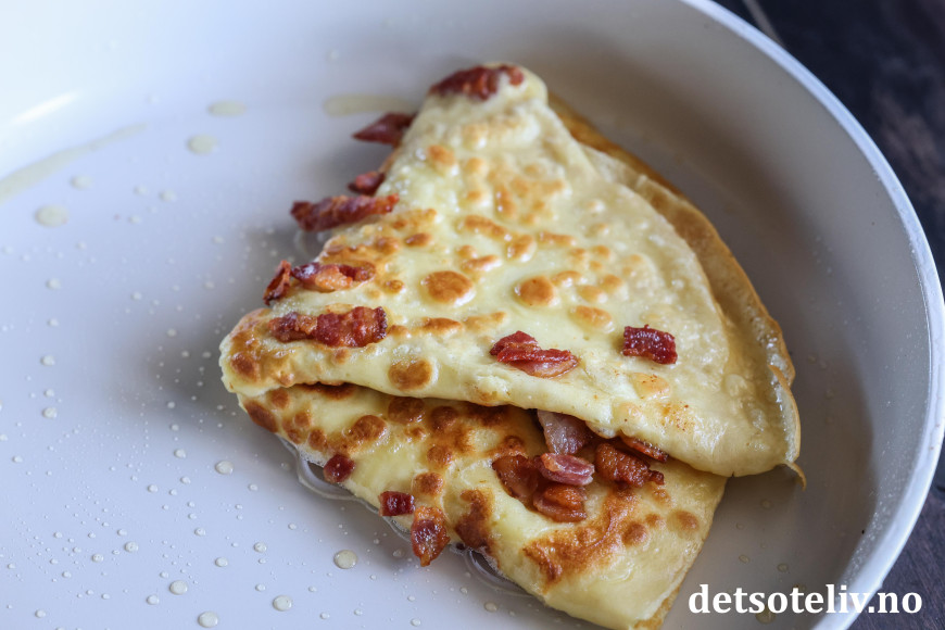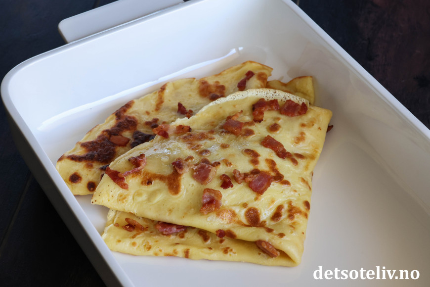 ♥ Merk at du må være rask med å drysse baconbiter på pannekakerøren, før pannekaken steker for mye, slik at baconbitene fester seg til pannekakene.