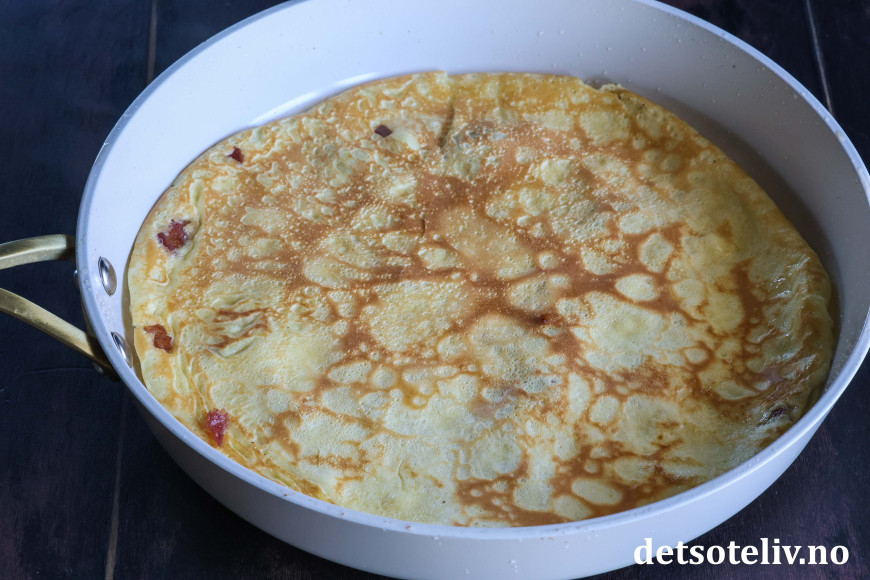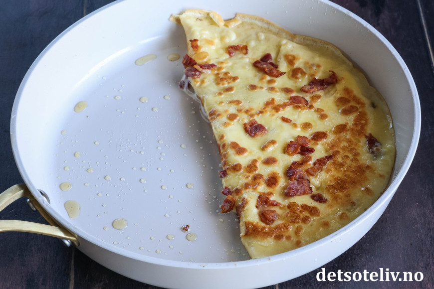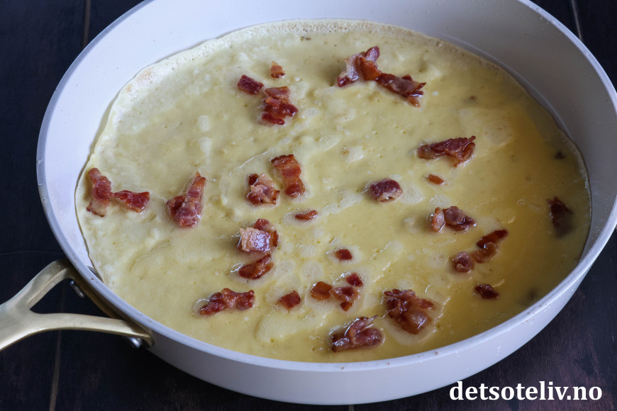 Ha først en øse pannekakerøre i pannen. Dryss straks over stekte baconbiter slik at baconbitene fester seg i pannekakerøren.