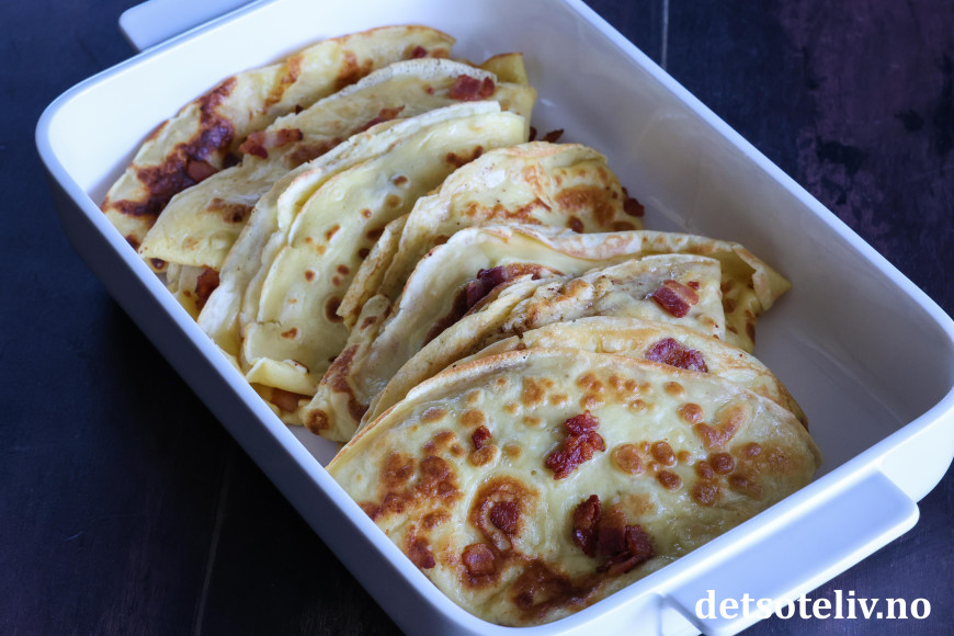 Legg de stekte pannekakene i en ildfast form og dekk til med aluminiumsfolie.