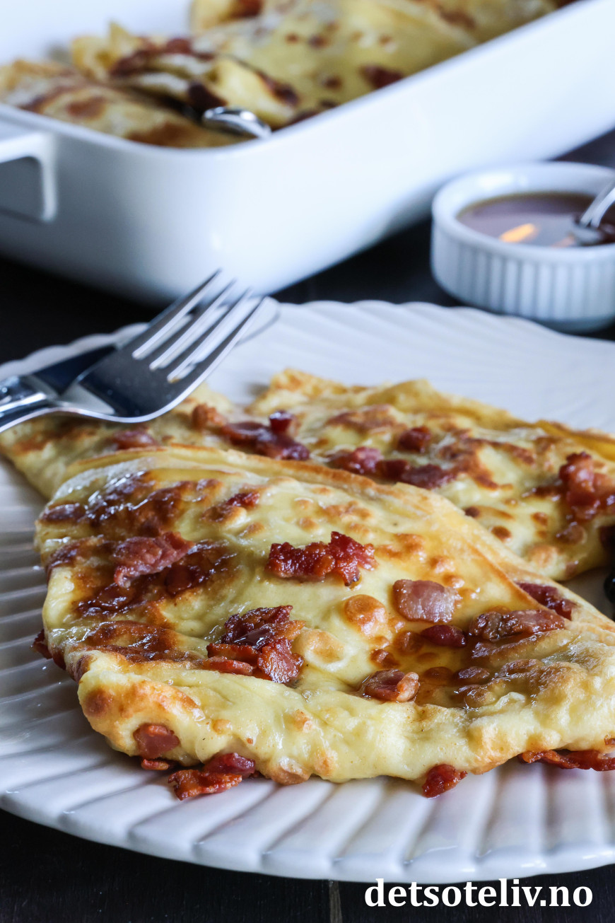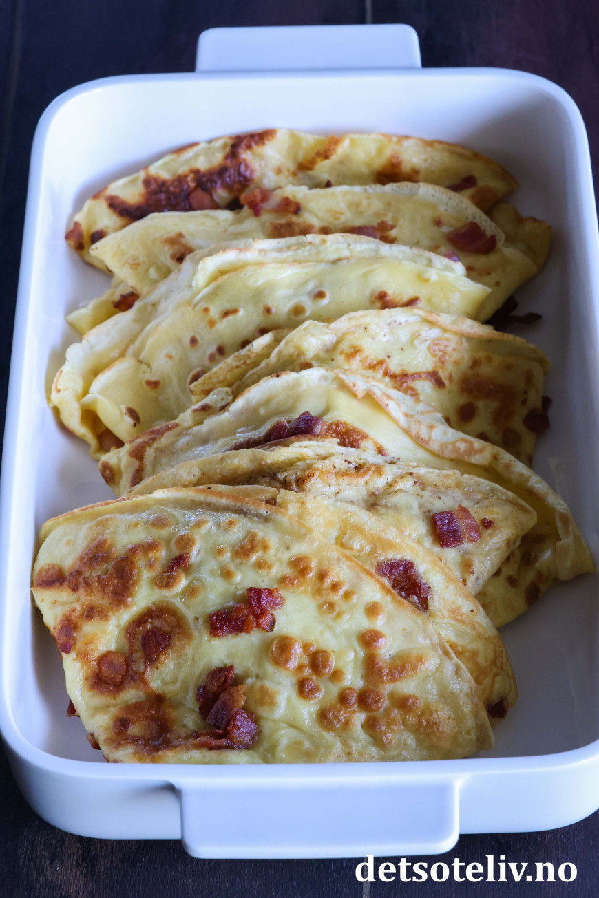 Stek tynne pannekaker i stekepanne på middels varme. Bruk litt av baconfettet og eventuelt litt ekstra smør i pannen.