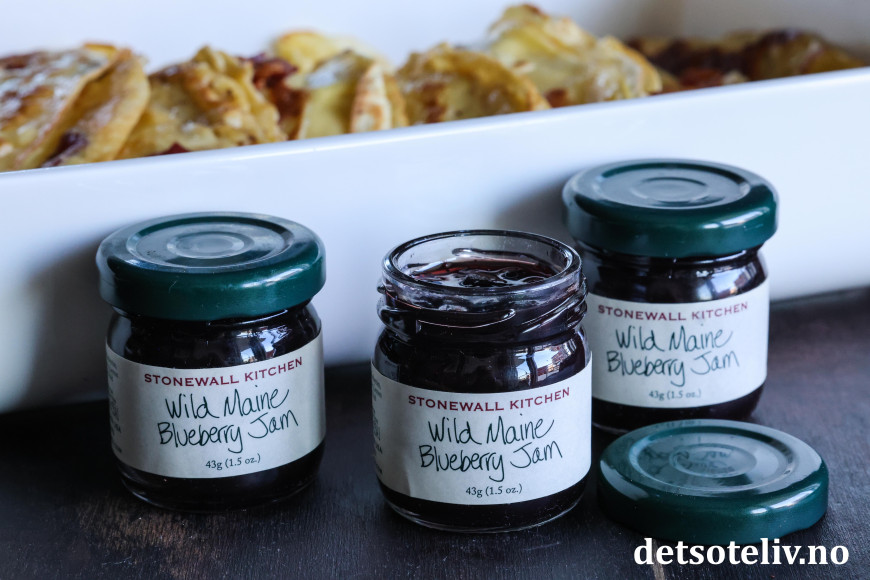 Server pannekakene, gjerne med blåbærsyltetøy og lønnesirup som tilbehør.