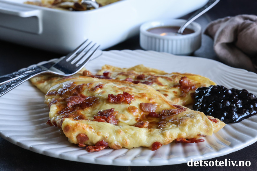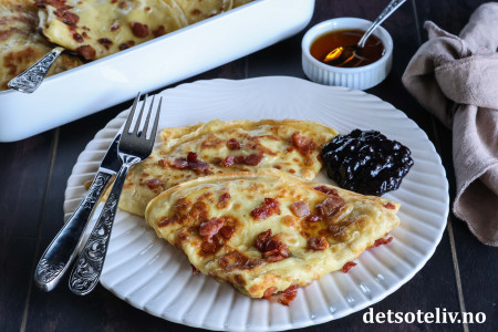 Se også Ovnspannekake med bacon (Stor fleskepannekake) som tilberedes i stor langpanne.