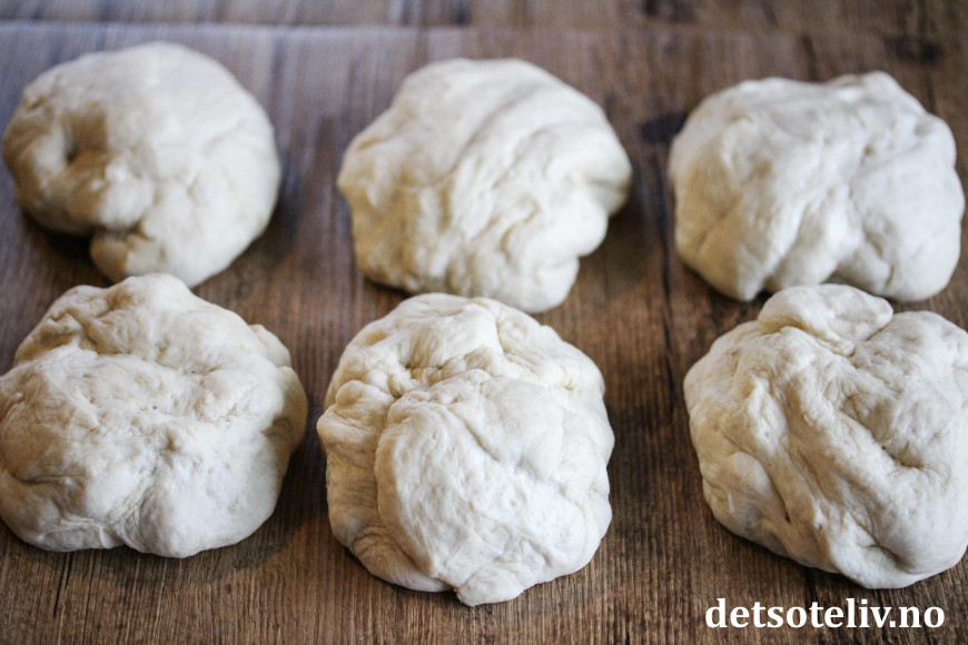 Bland salt med litt av melet og rør inn. Ha deretter i resten av hvetemelet. Elt deigen i 10 minutter til en jevn og smidig deig. La den heve i 1 time.