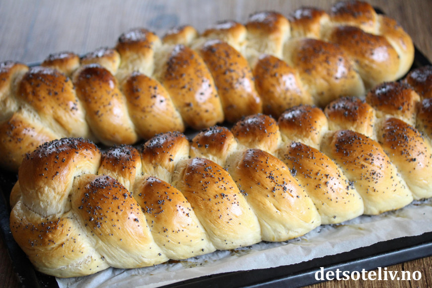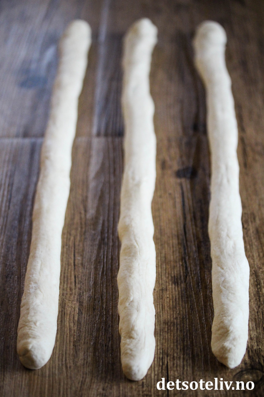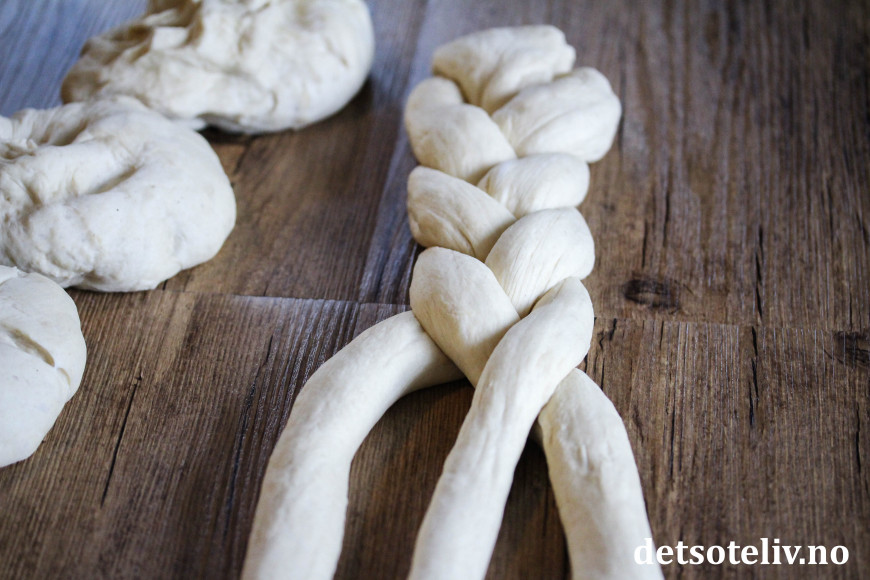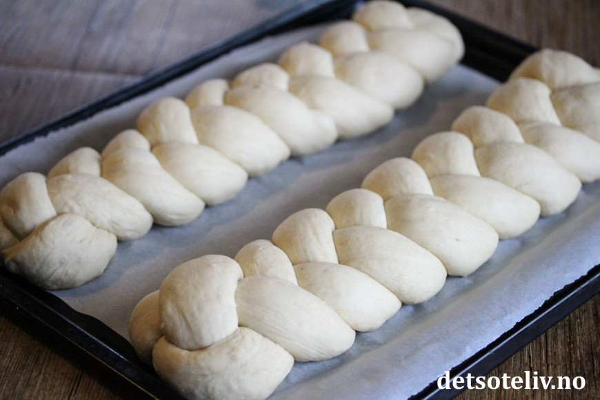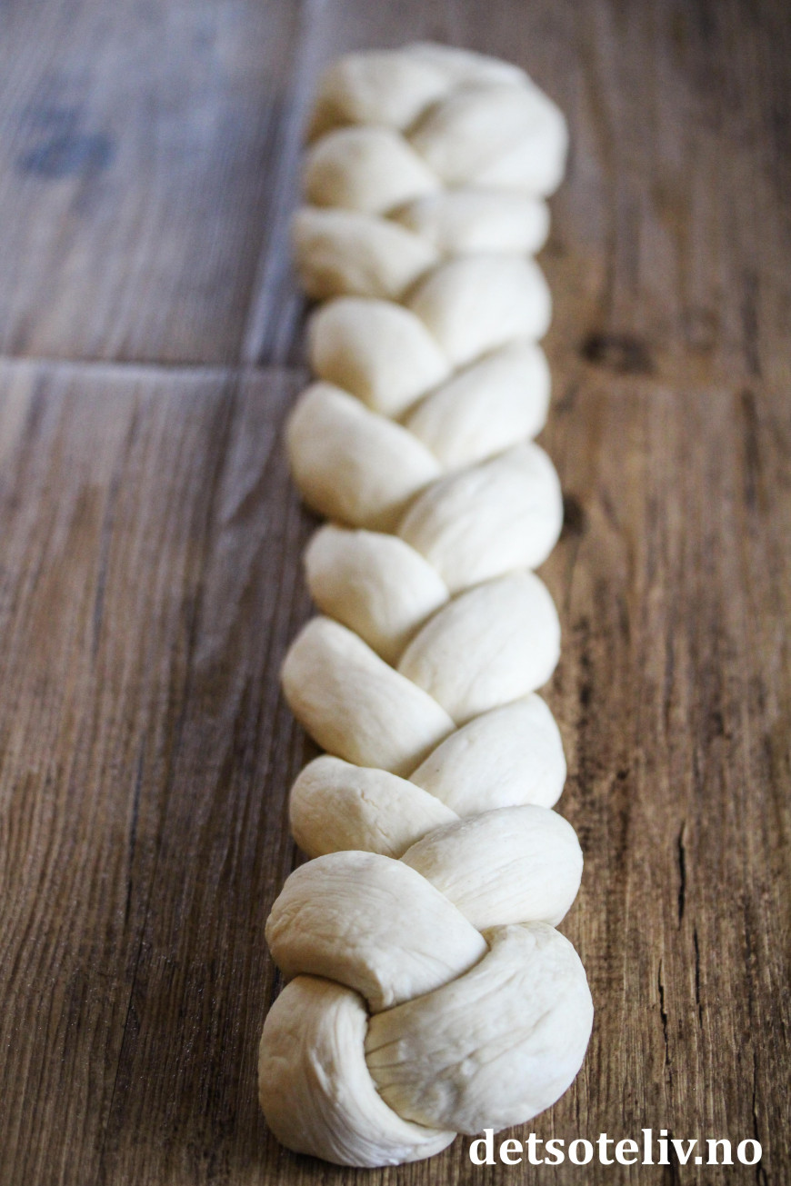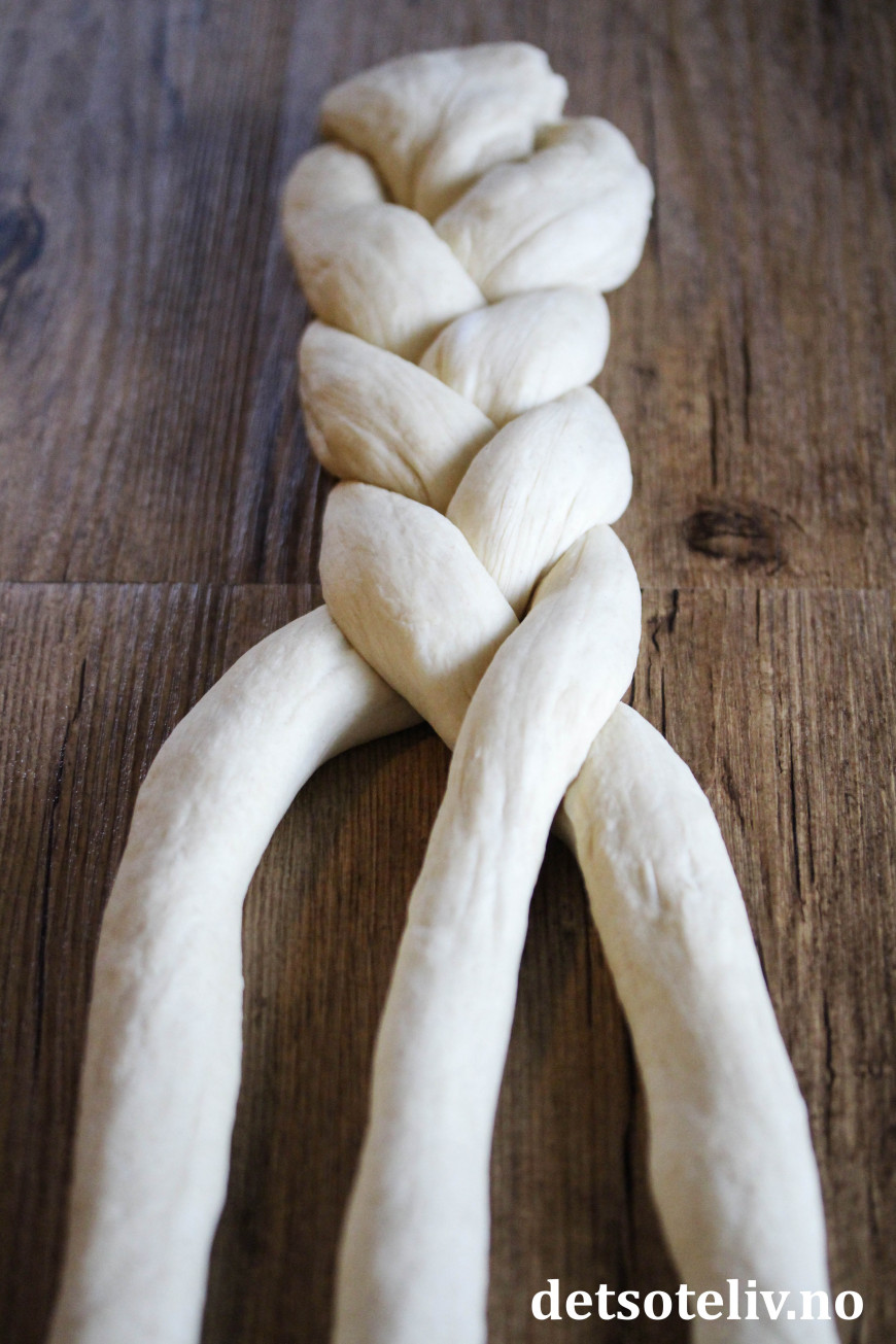 Del deigen i 6 like store emner (ca. 330 gram per del). Trill ut hvert emne til lange stenger. Flett tre av dem til en flette som er omtrent like lang som en stekeplate. Jevn til endene på fletten og legg den på en bakepapirdekket stekeplate.