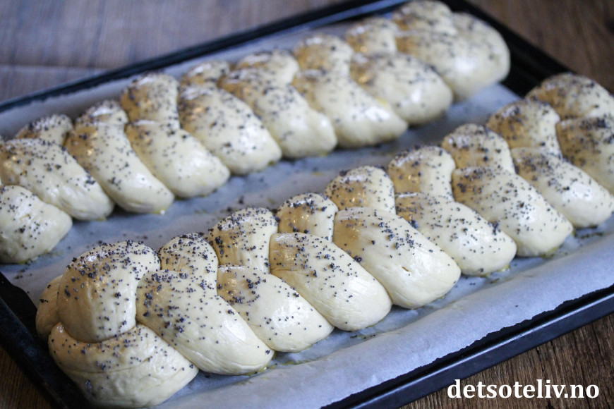 Pensle over flettene med sammenvispet egg og dryss over valmuefrø.