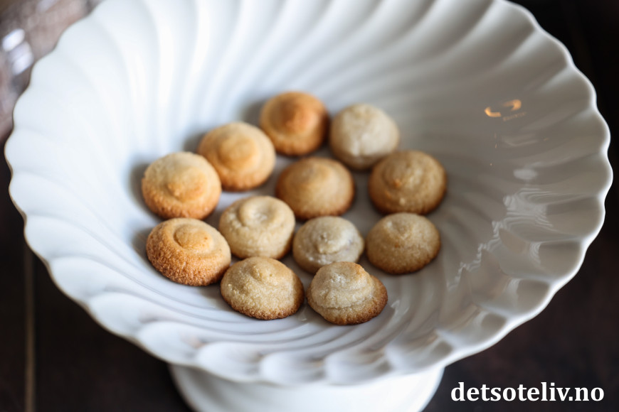 Finn frem mandelmakroner (se oppskrift HER), kokosboller og bringebær.