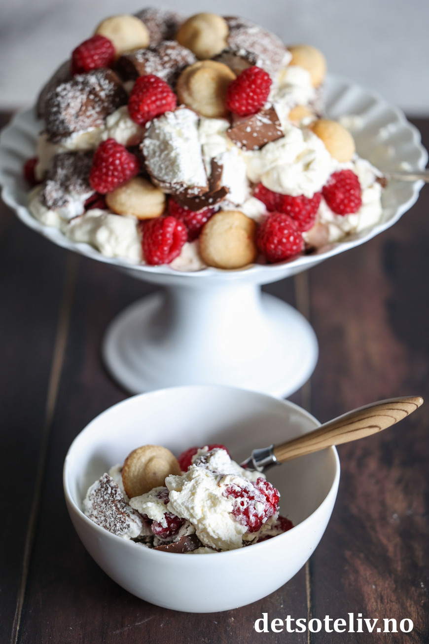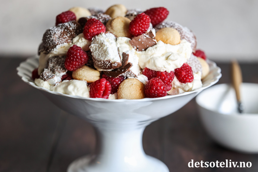 Her kommer en dansk "Flødebolledessert med makroner og hindbær".