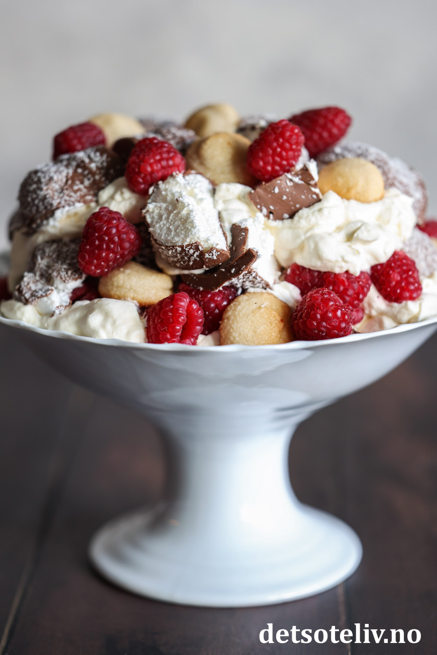Desserten består av kokosboller, fløtekrem, enkle mandelmakroner og bringebær, som legges lagvis i en dyp serveringsskål.
