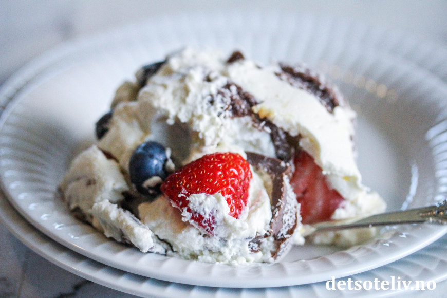 For en versjon med makroner, se Flødebolledessert (kokosbolledessert) med makroner og bringebær.