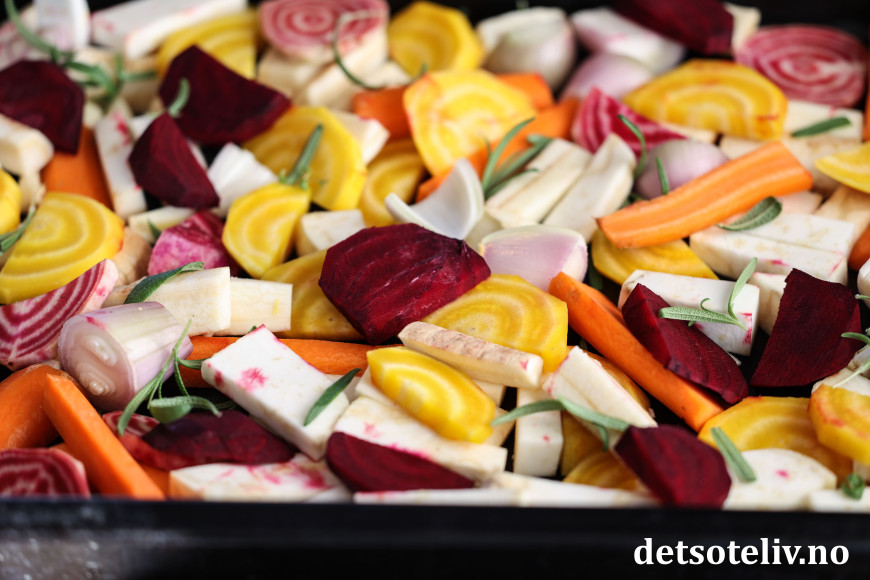 Sett grønnsakene i ovnen når kjøttet nærmer seg ferdig, midt i ovnen ved 200°C i ca. 30 minutter.