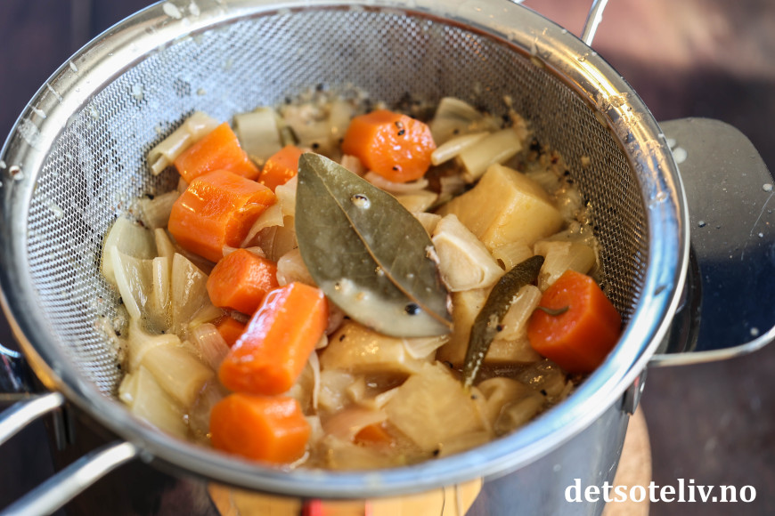 Når oksesteken er ferdig braisert (kokt), løftes den forsiktig ut av gryten. Sil kraften som er igjen i kjelen.