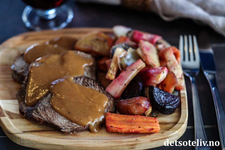 Skjær opp oksesteken i skiver og server sammen med ovnsbakte rotgrønnsaker og nydelig saus. Kokte eller fløtegratinerte poteter gjør seg også veldig godt som tilbehør, selv om dette ikke kom med på bildene her.. 😊
