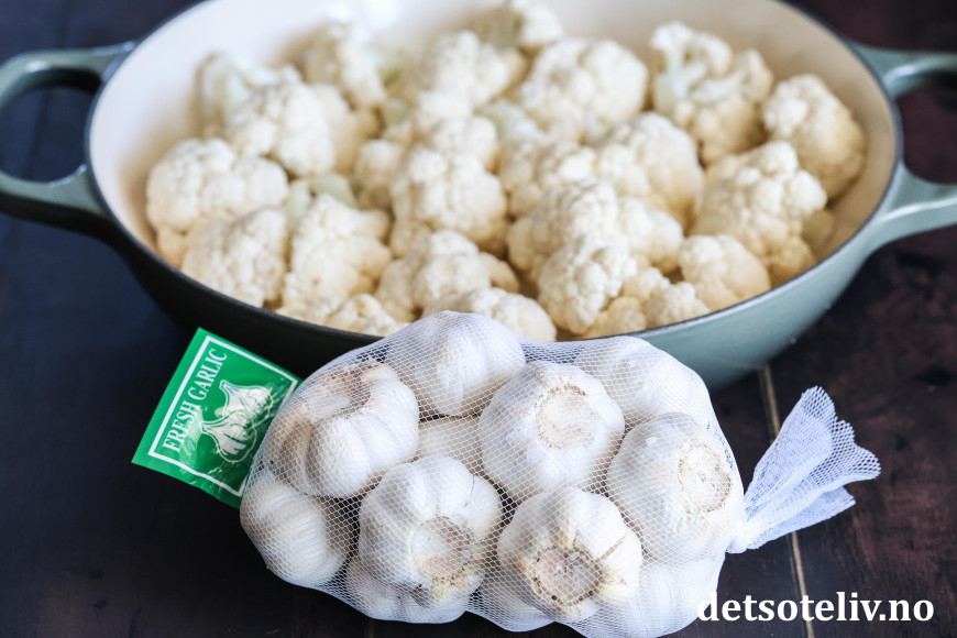 Kutt opp ønsket mengde hvitløksfedd i skiver. Fordel hakket hvitløk over blomkålbukettene.
