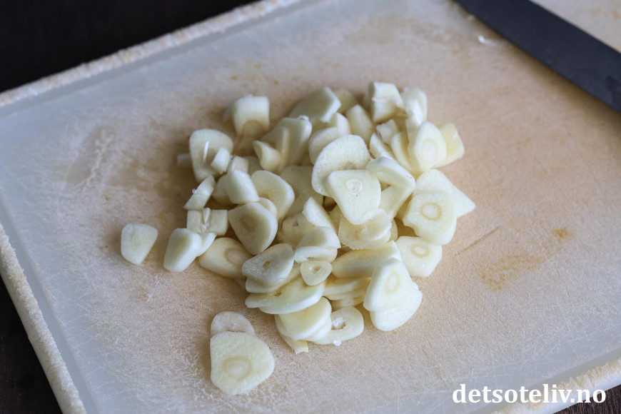 Kutt opp ønsket mengde hvitløksfedd i skiver.