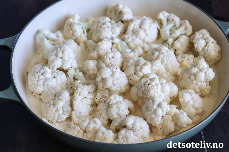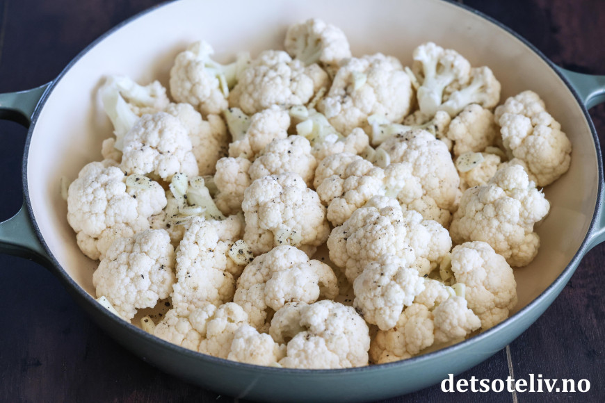 Rens blomkålhodene for blader og kutt dem opp i buketter. Legg dem i en ildfast form (jeg brukte her en buffetgryte, ca. 30 cm i diameter, se tips).