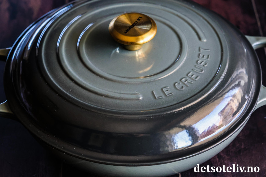 ♥ Jeg brukte her en buffetgryte, 30 cm i diameter. Du kan alternativt bruke en ildfast form på størrelse med en mellomstor langpanne. Siden du da ikke har lokk, kan du dekke over formen med aluminiumsfolie den første halvtimen i ovnen.