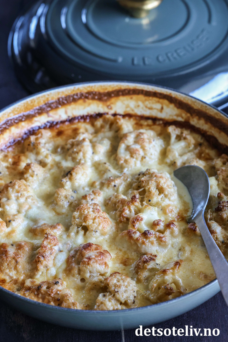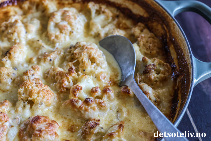 ♥ Fløtegratinert blomkål er nydelig tilbehør til mange slags middager. Se for eksempel Biff med fløtegratinert blomkål og rødvins- og gorgonzolasaus.