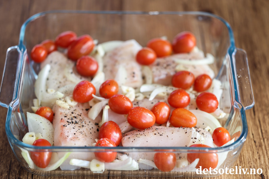 Skjær løken i skiver og legg mellom fisken. Skjær hvitløksfedd i skiver og dryss over. Legg småtomatene hele i formen. Kvern over godt med salt og pepper.