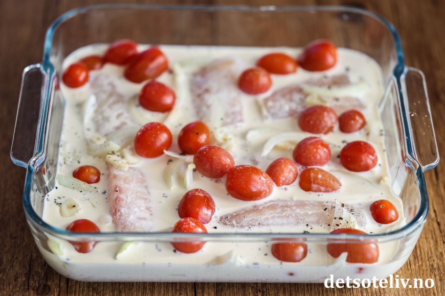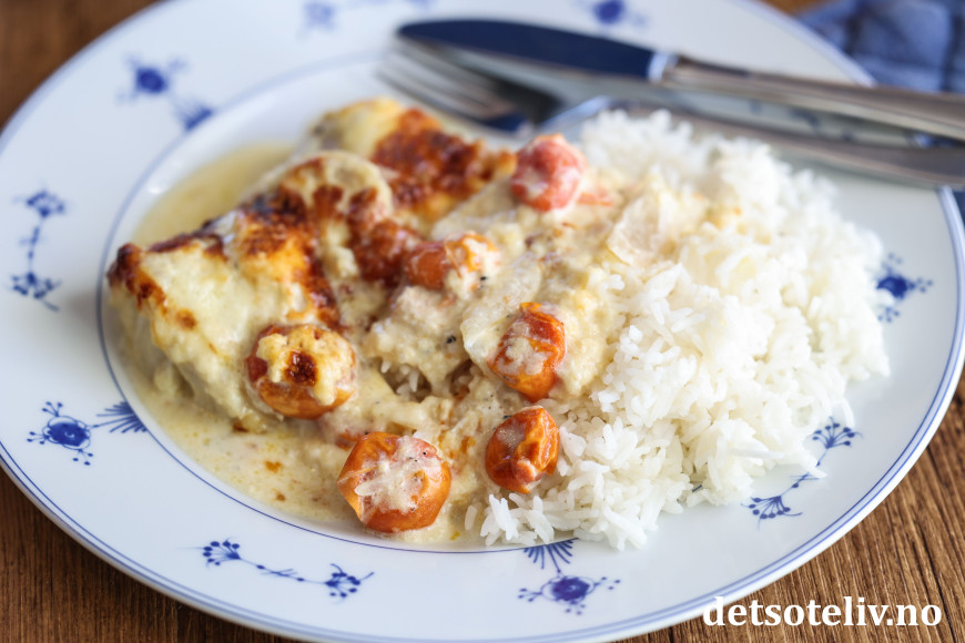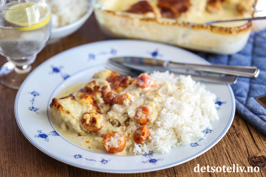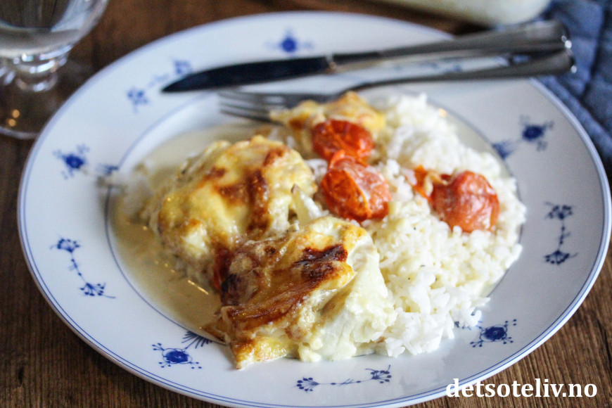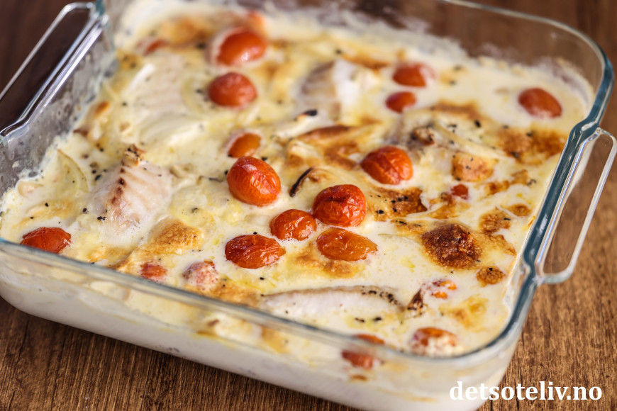 Her ovnsbakes torskefileter i fløte sammen med løk, hvitløk og cherrytomater, og gratineres til slutt med smakfull ost. Det dannes masse deilig fløtesaus i formen, som gjør at kokt ris er perfekt tilbehør.