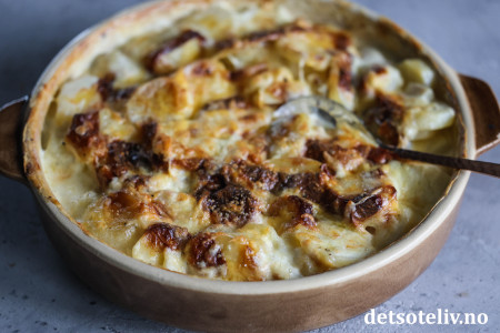 Skrell potetene og skjær dem i skiver. Ha potetene i en smurt, ildfast form (27 cm i diameter eller på størrelse med liten langpanne 20 x 30 cm).