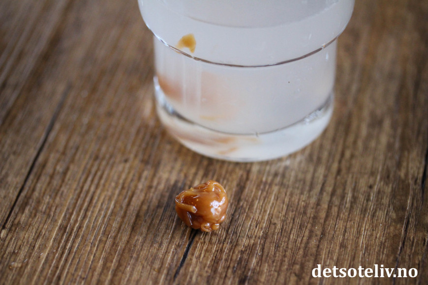 ♥ Har du ikke sukkertermometer, kan du i stedet sjekke konsistensen på karamellmassen ved å benytte deg av «karamelltesten». Karamelltesten innebærer at du heller en teskje med karamellmasse i et glass med kaldt vann. Når karamellmassen har kokt lenge nok, vil vannet forbli klart og karamellmassen synke til bunnen av glasset slik at den kan tas opp og rulles til en kule som er passe myk i konsistensen.