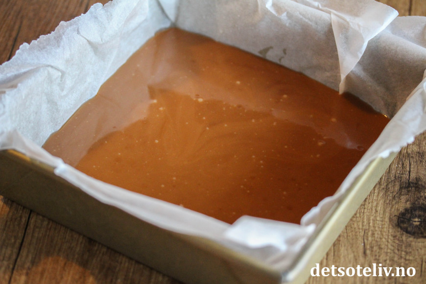 Ha bakepapir i en form (ca. 20 x 20 cm) og smør over med litt olje. Hell karamellmassen i formen.