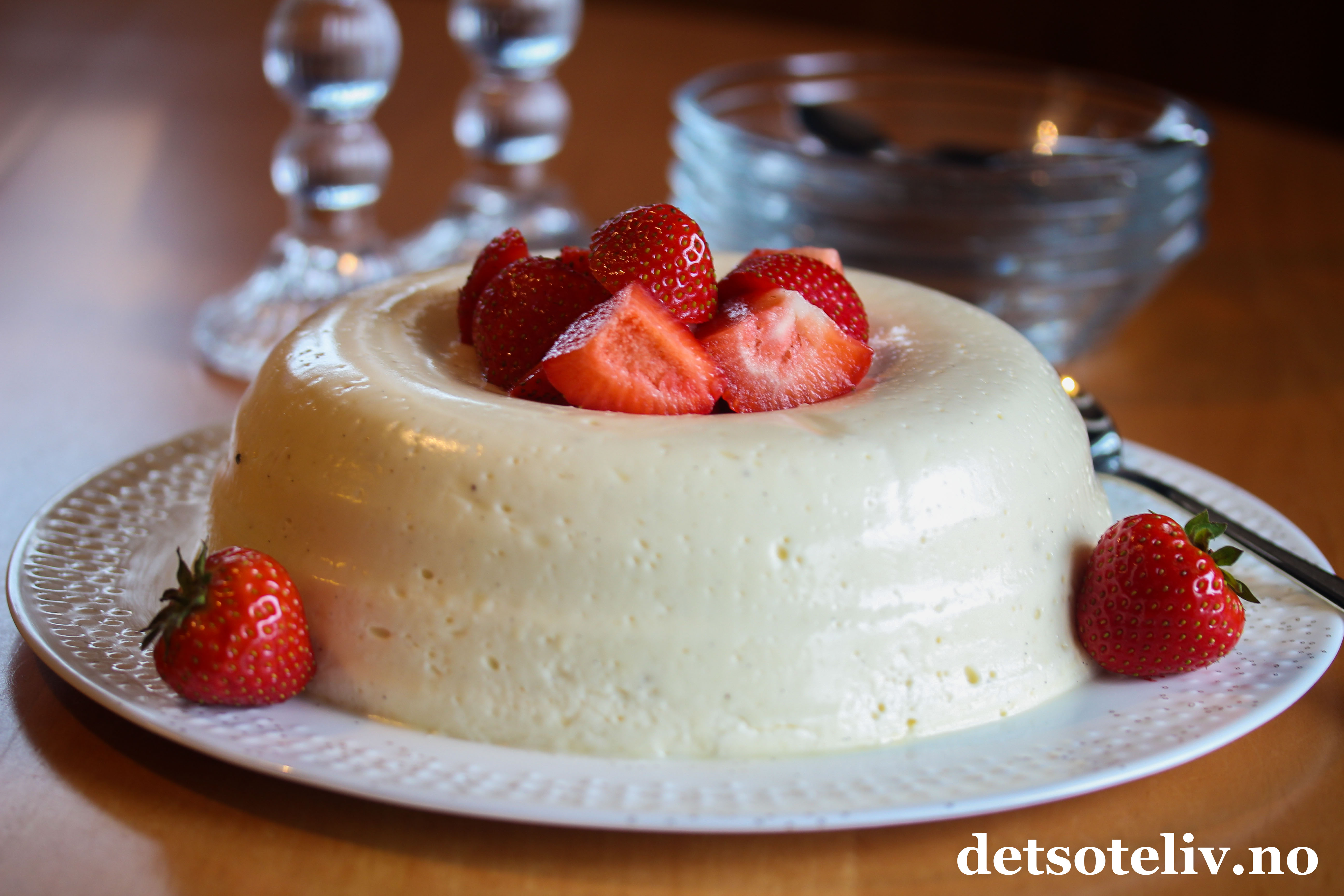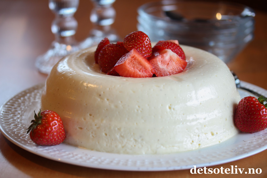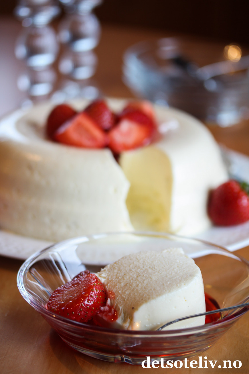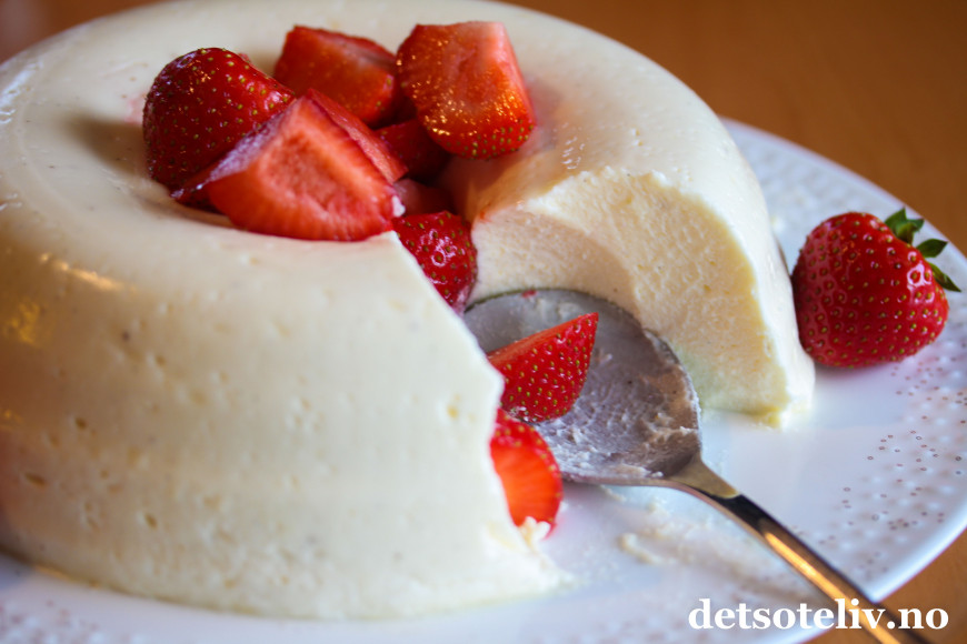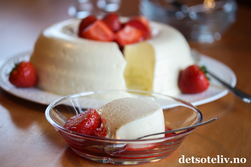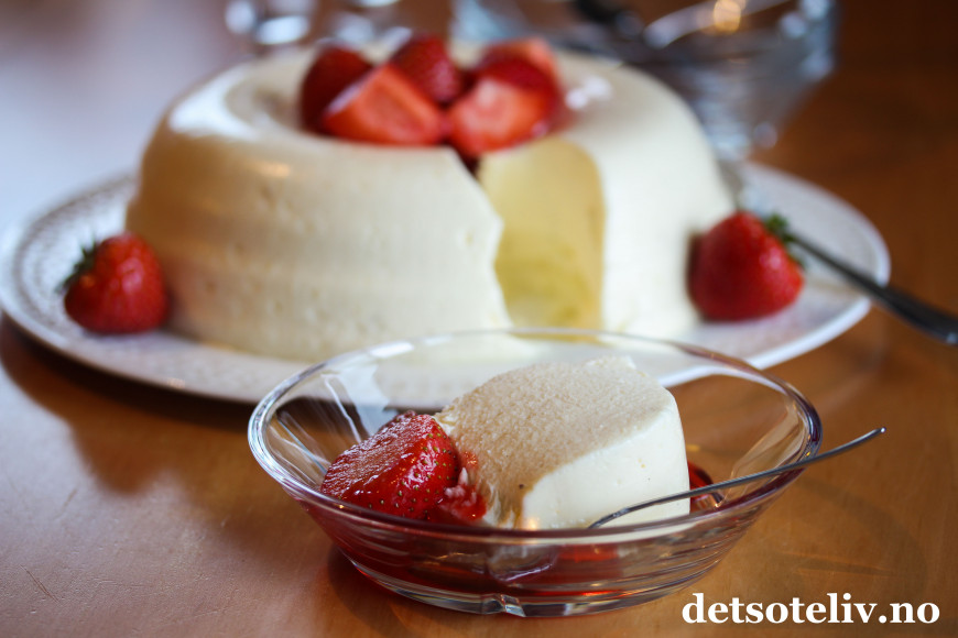 Her har jeg servert desserten med friske jordbær, men desserten er så fin og mild i smaken at den utmerket kan serveres til alle slags typer bær, frukt, hermetisk frukt, bærsauser, fruktkompott osv osv.