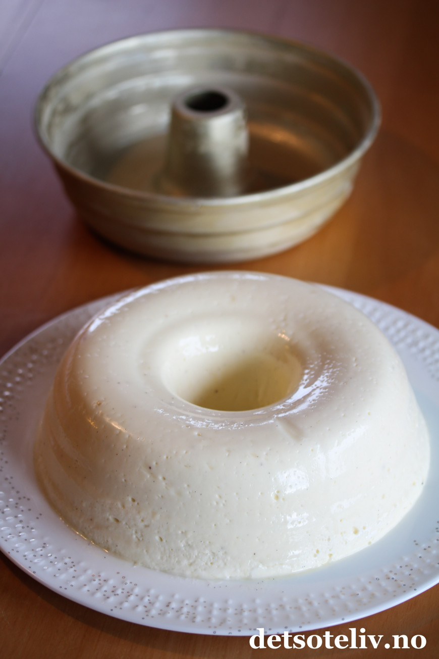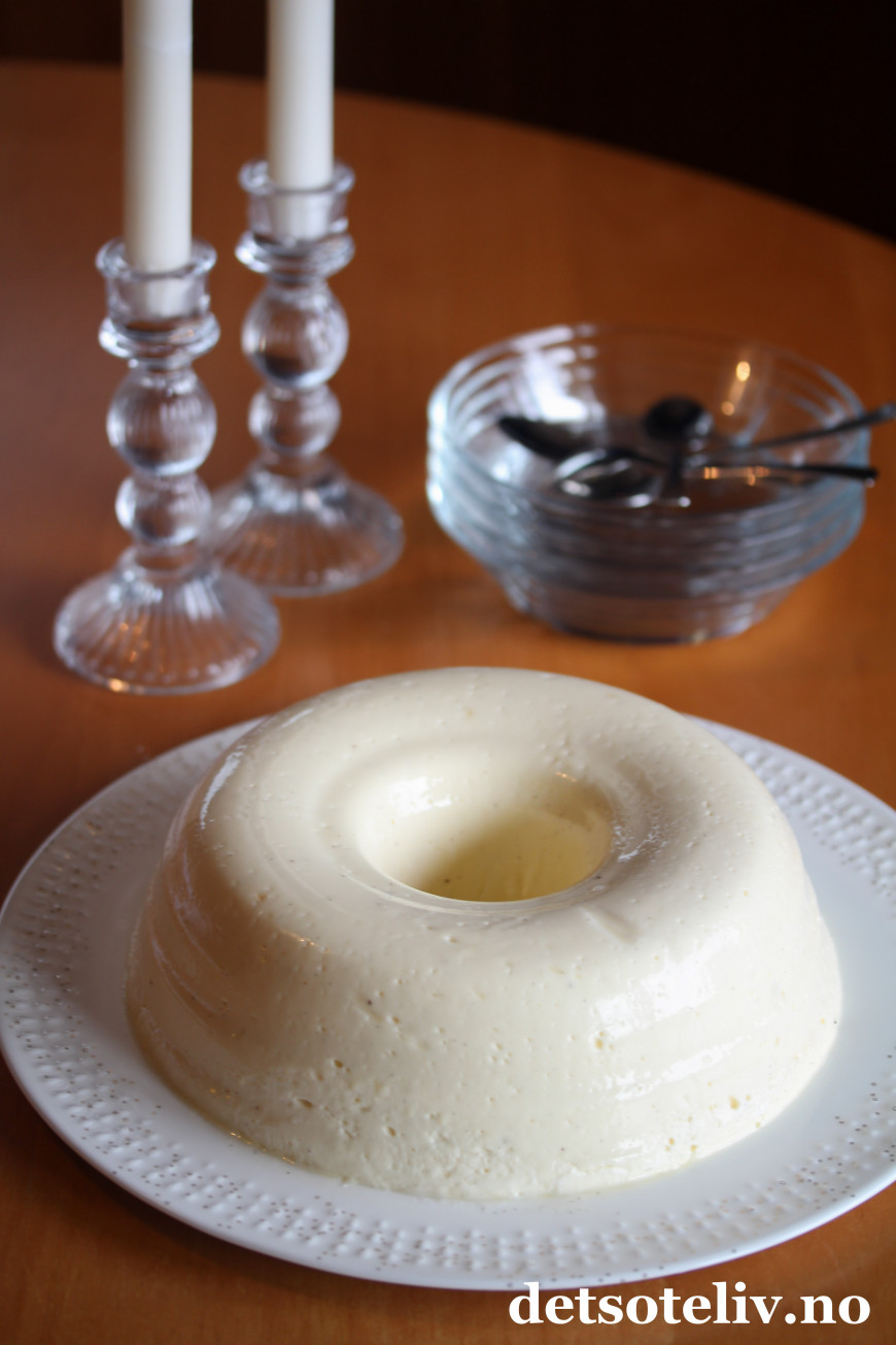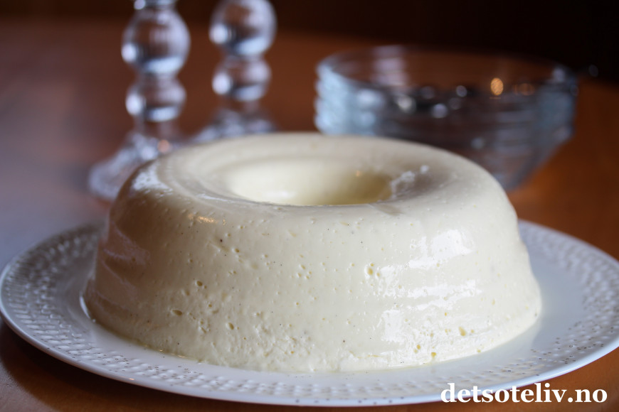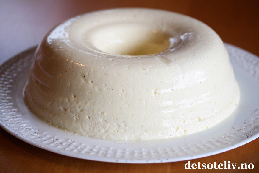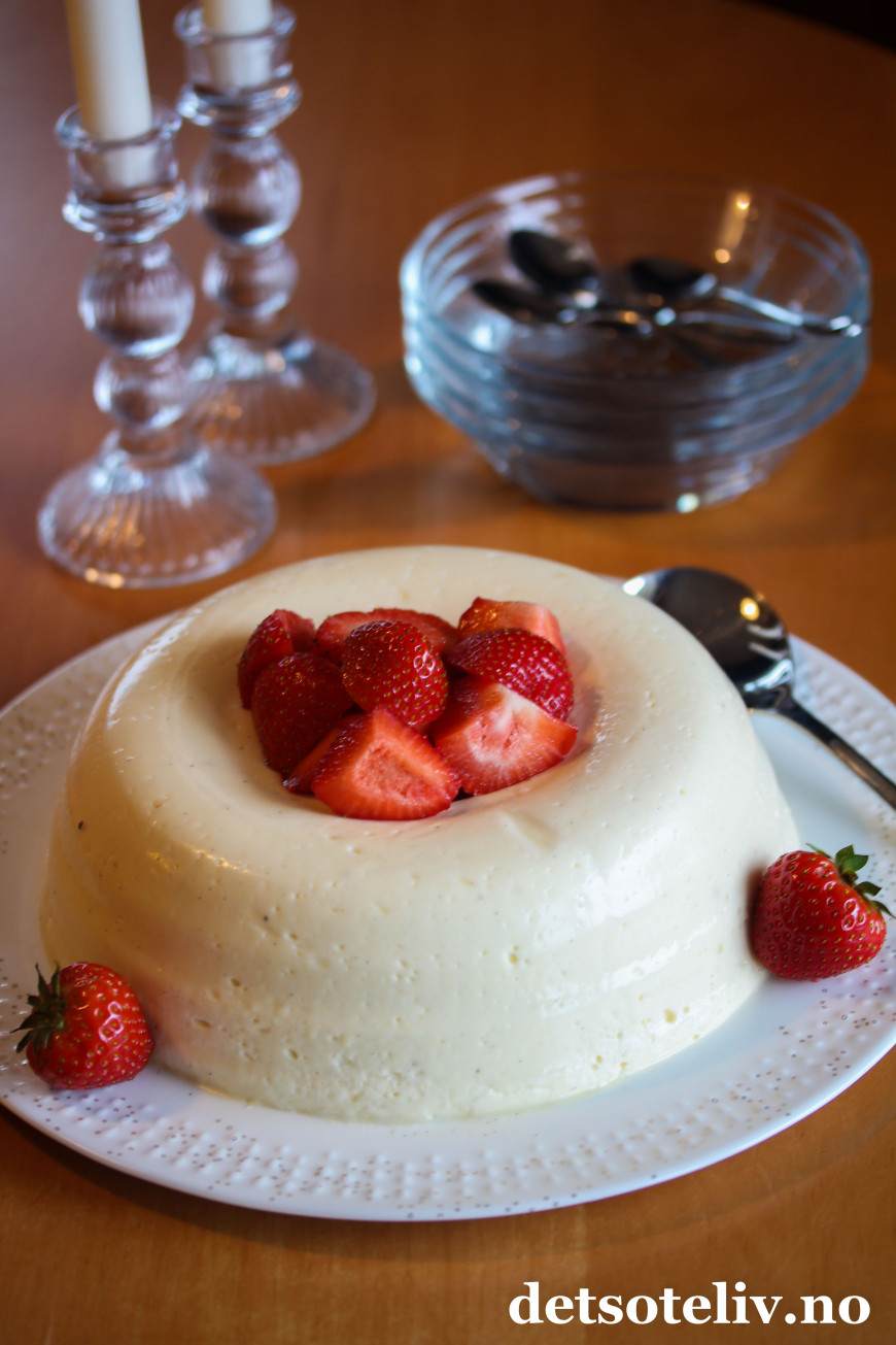 Her har jeg servert desserten med friske jordbær, men desserten er så fin og mild i smaken at den utmerket kan serveres til alle slags typer bær, frukt, hermetisk frukt, bærsauser, fruktkompott osv osv.