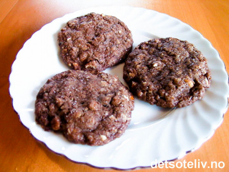 Smelt kokesjokoladen sammen med litt av smøret i en liten kjele på svak varme. Avkjøl. Pisk resten av smøret (som bør være romtemperert) sammen med brunt sukker og vaniljeessens. Pisk inn egget. Rør inn den avkjølte sjokoladen. Sikt sammen natron og hvetemel og rør i sammen med melk. Ha til slutt i havregryn, rosiner og hakkede mandler.