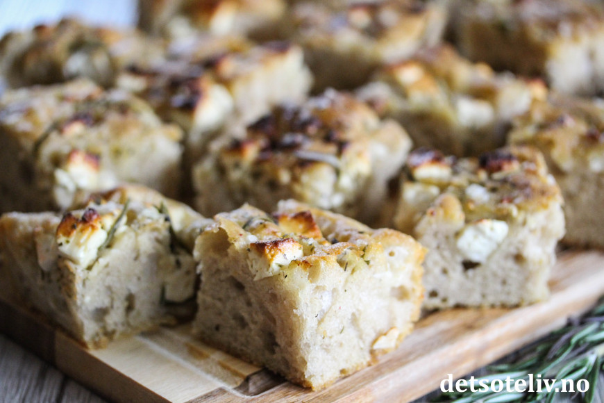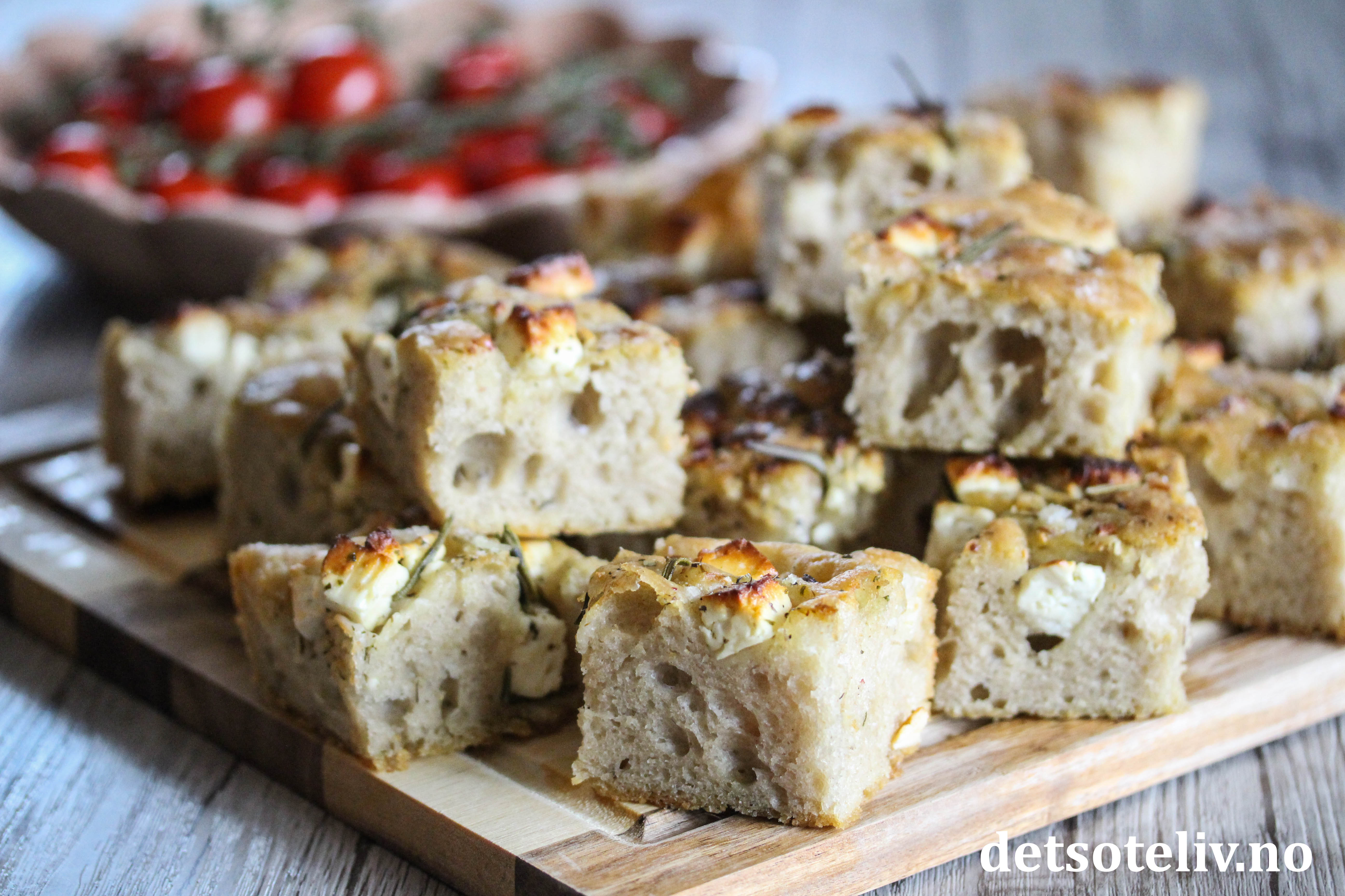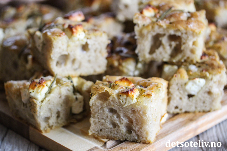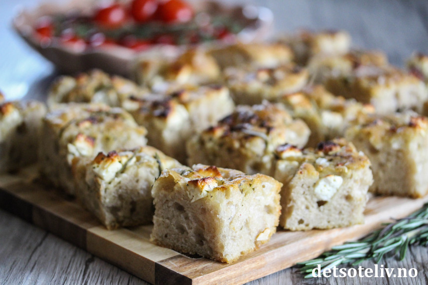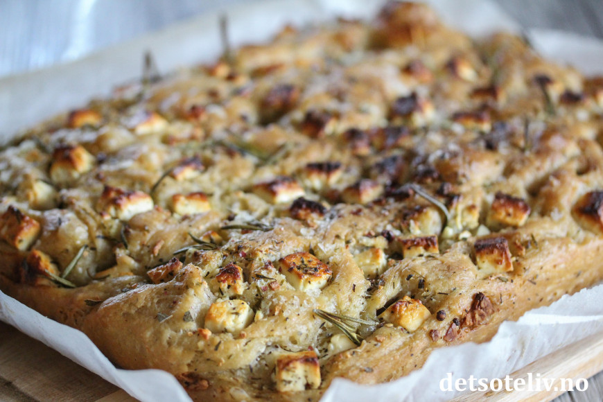 Sett varm og nybakt Focaccia med fetaost og urter på bordet, og du blir garantert populær!