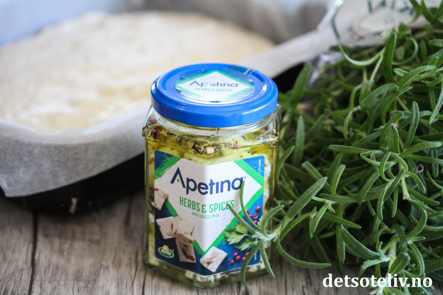 Det holder jo fint med 1 glass fetaost til denne focacciaen, men er du veeeldig glad i masse fetaost (yes, I am... ), kan du bruke osten fra 2 glass som jeg gjør.