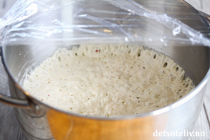 La deigen stå og heve i romtemperatur i 12 – 18 timer. Hvis du eksempelvis rører sammen deigen kl. 22 på kvelden, er deigen klar til å stekes kl 16 dagen etter.