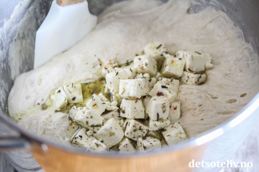 Løsne deigen fra kanten av bakebollen med en slikkepott uten å slå ut luften fra deigen. Ha ønsket mengde fetaost i deigen og vend rundt helt forsiktig med slikkepotten. Det er som sagt om å gjøre å bevare mest mulig av luften i deigen.