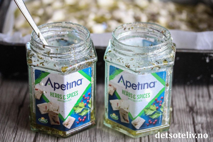 ♥ Jeg har her brukt urtemarinert fetaost som kjøpes på glass. I stedet for olivenolje, bruker jeg altså urteolje fra glasset.