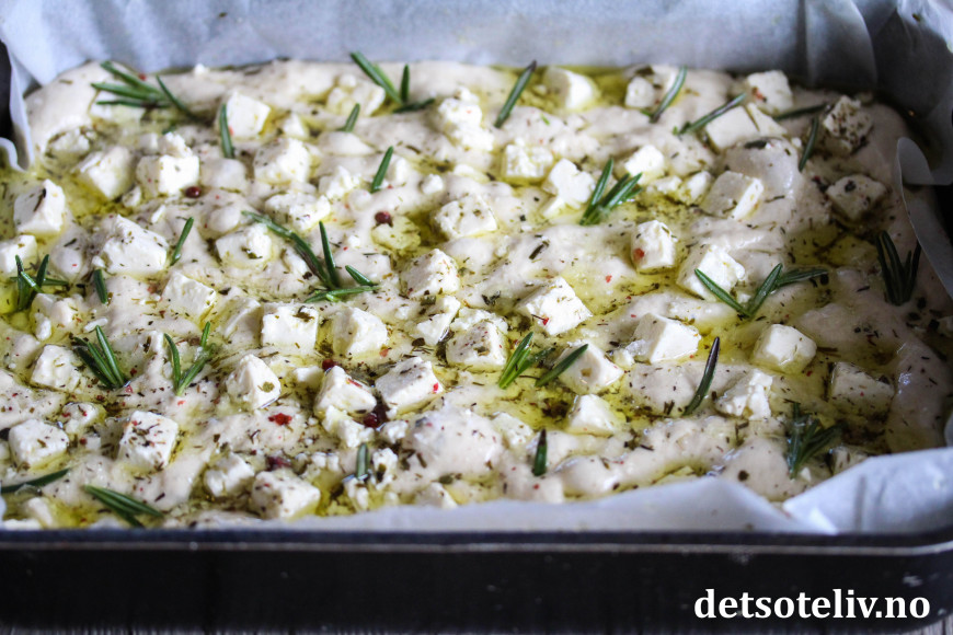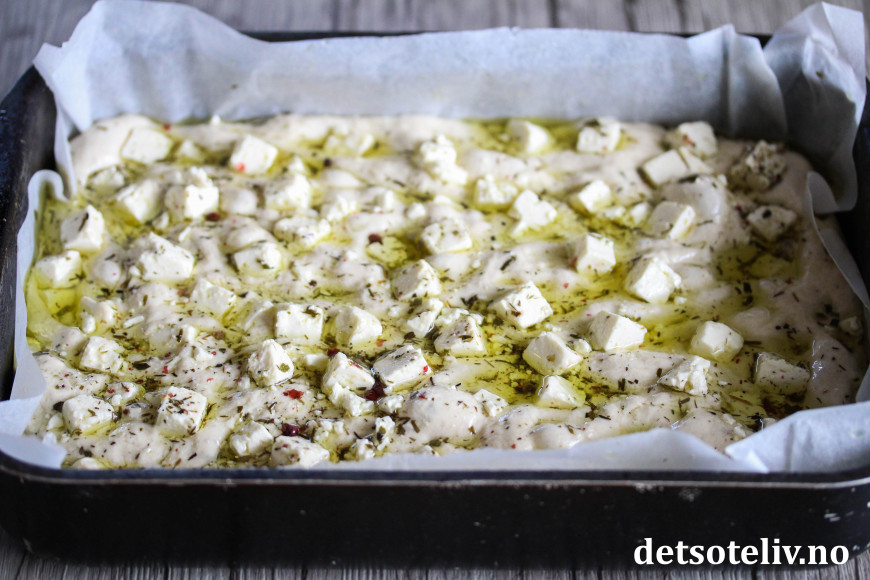 Ha godt med urteolje på fingrene slik at deigen ikke klisser og trykk deigen jevnt utover i langpannen. Lag deretter dype groper i deigen med fingrene. Fordel over så mye mer urteolje og fetaost du ønsker (se tips).