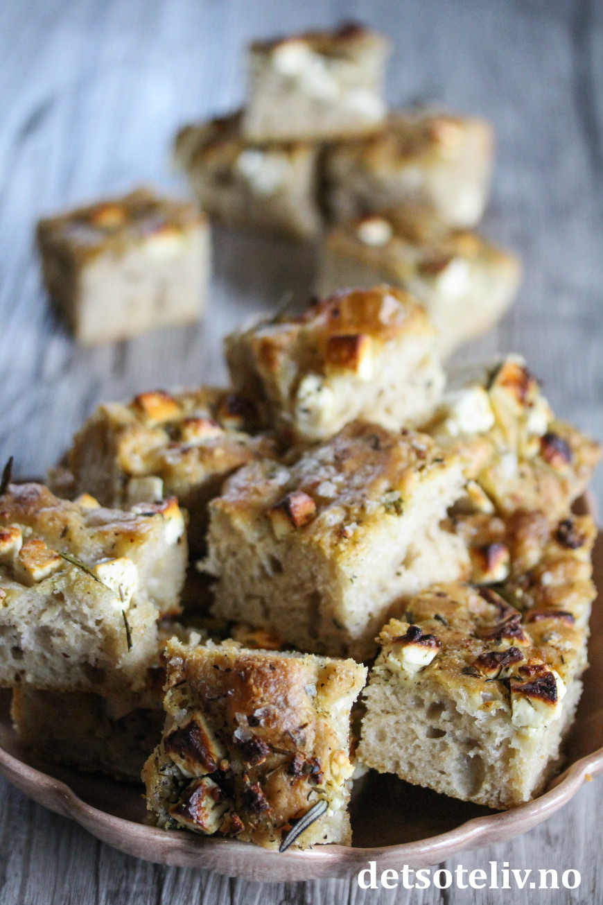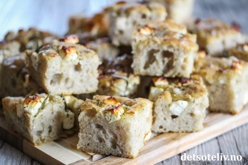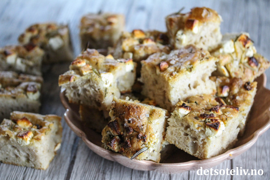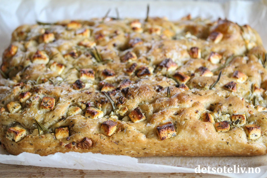 ♥ Husk at fetaost er nokså salt i seg selv. Bruker du 2 glass fetaost som jeg gjør, er det greit å droppe salt i deigen, og pass også på at du ikke drysser for mye salt på toppen av focacciaen.