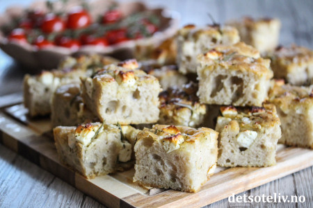 Stek focacciaen midt i ovnen ved 225°C i ca. 30 minutter, til den er gyllen og gjennomstekt. Avkjøl på rist og skjær opp i biter før servering.