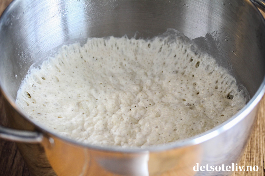 Dekk til bakebollen godt med plastfolie eller et lokk. La deigen stå og heve i romtemperatur i 12 – 18 timer. Hvis du eksempelvis rører sammen deigen kl. 22 på kvelden, er deigen klar til å stekes kl 16 dagen etter.
