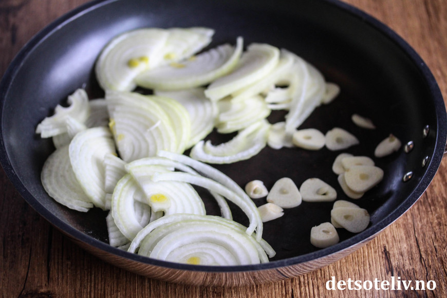 Skjær løk og hvitløk i tynne skiver. Stek dette i stekepanne med olivenolje.