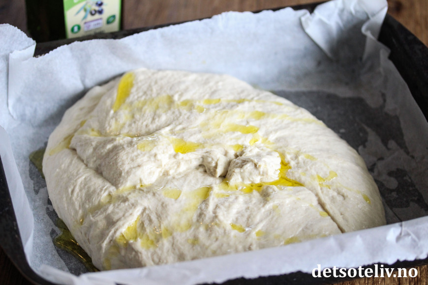 Drypp en spiseskje olivenolje over den klissete deigen. Bruk hånden og fordel oljen godt over deigen, og gjerne på undersiden også.