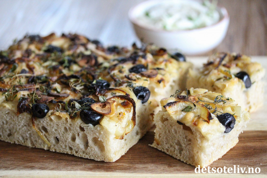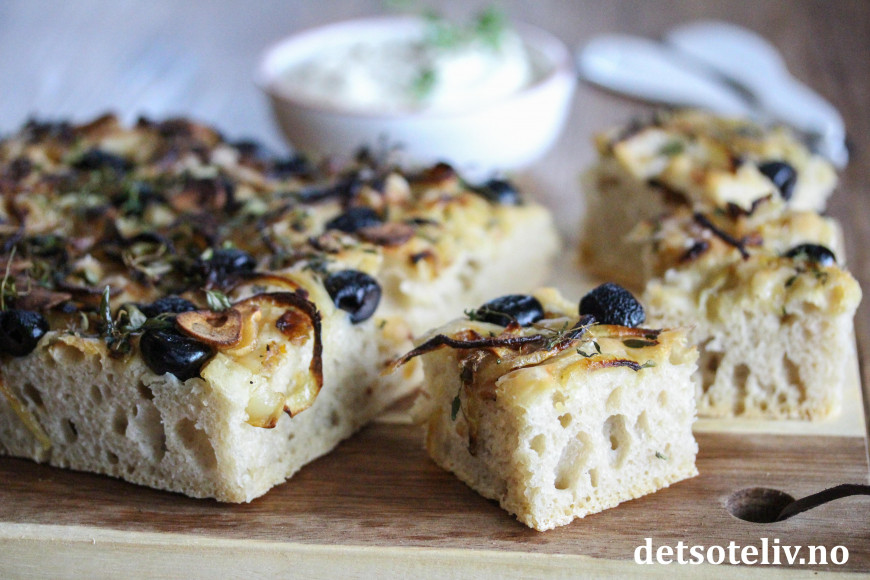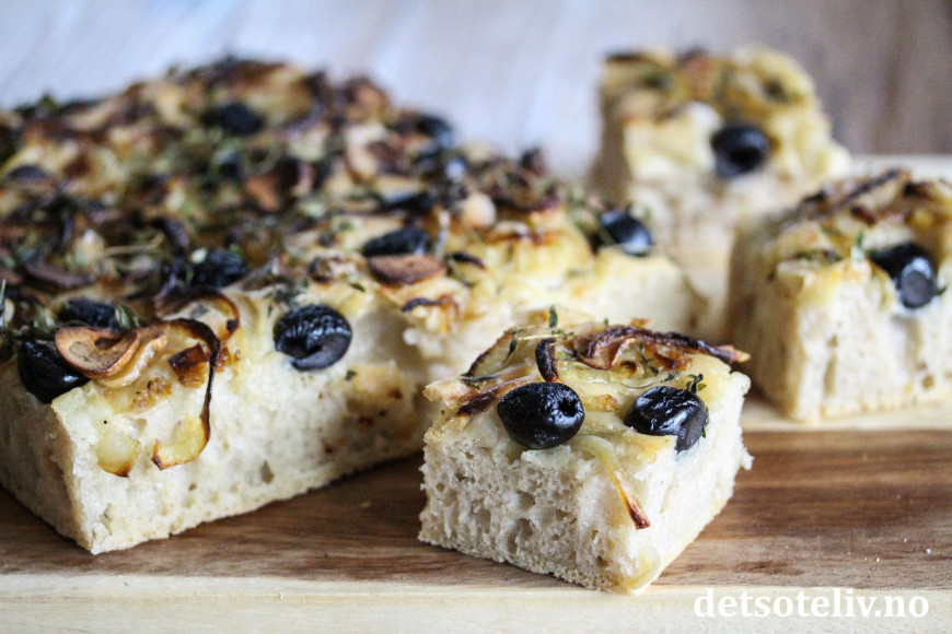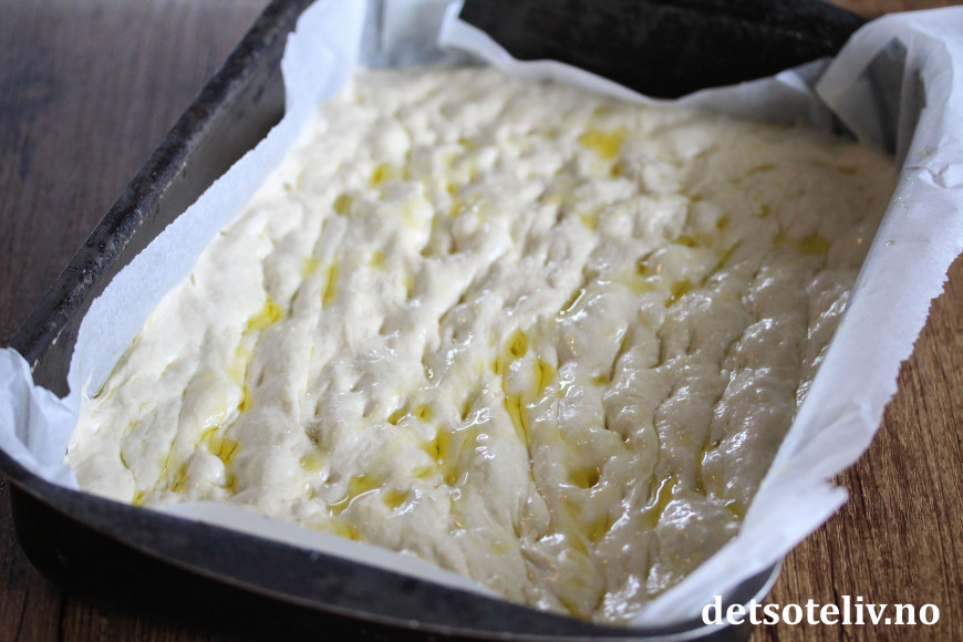 ♥ Oppskriften er basert på Eltefri focaccia, som skal heves over natten. Se også Focaccia med løk og andre varianter av focaccia her på Det søte liv.