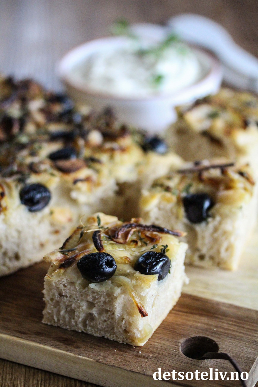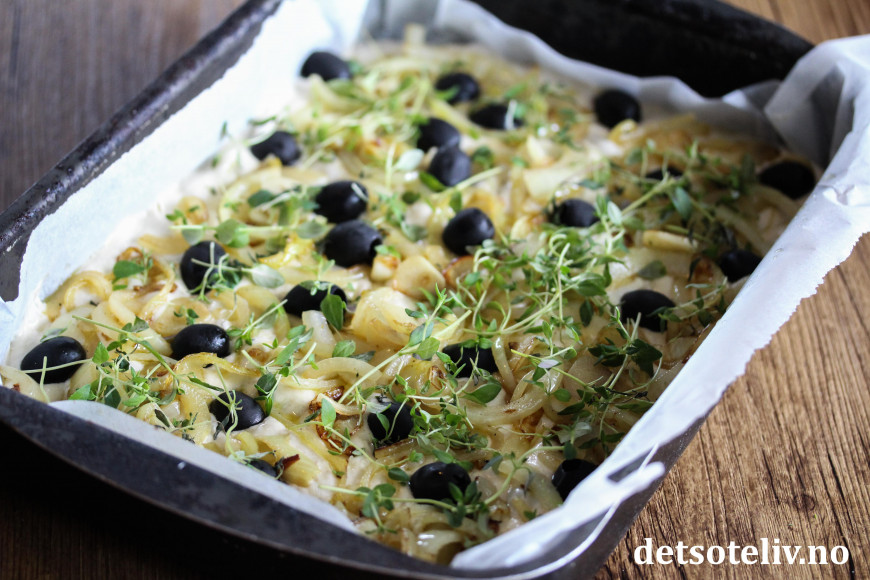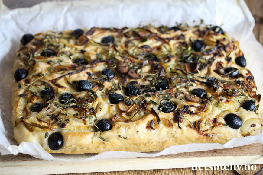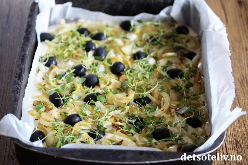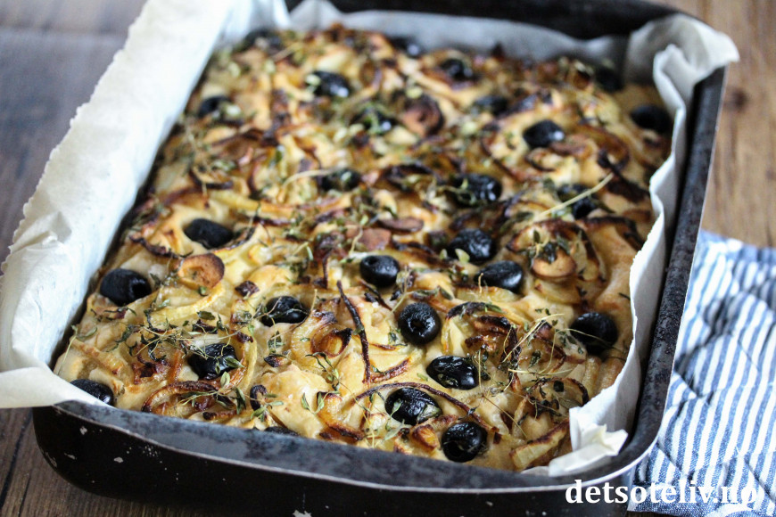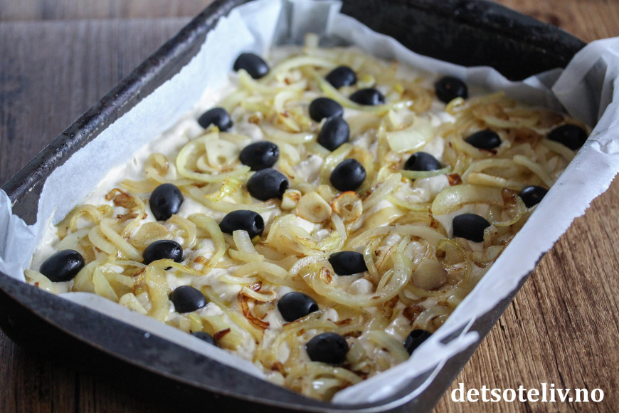 Fordel den stekte løken over focacciaen. Stikk oliven ned i deigen.