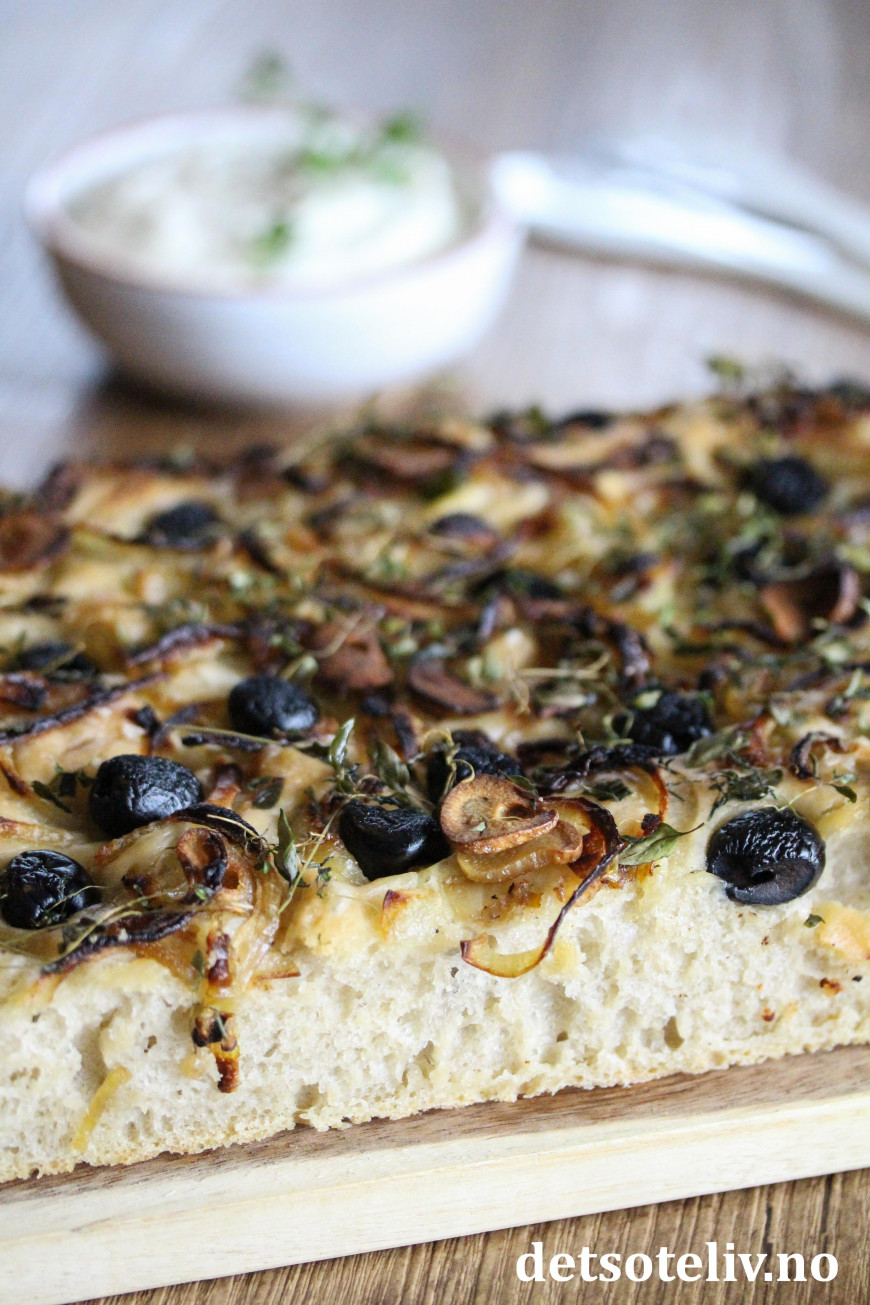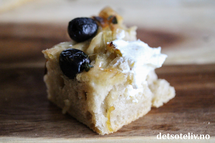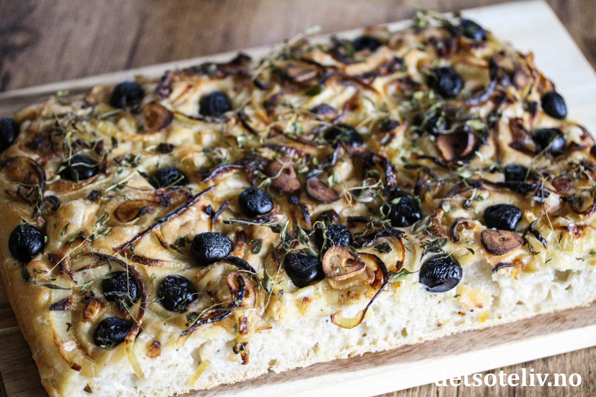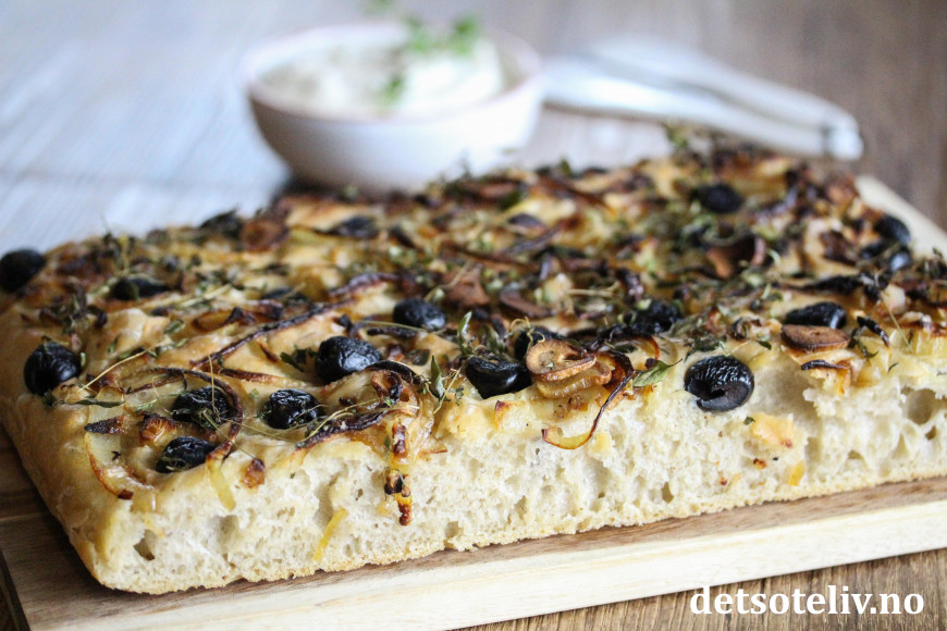 Jeg koser meg med langhelg og kan i dag friste med en myk og nystekt focaccia med karamellisert løk, oliven og fersk timian. Oh lord, så god den ble!