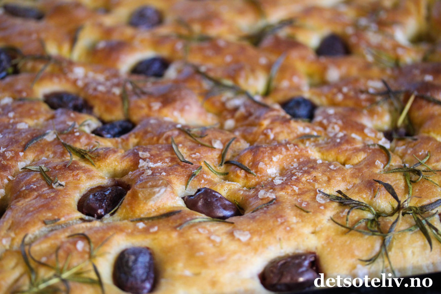 ♥ Husk at oliven også gir litt salt smak på focacciaen, så ikke overdriv mengden maldonsalt på toppen - da kan det lett bli for salt.