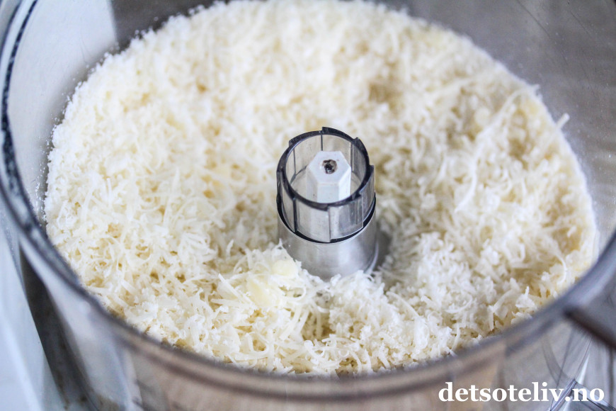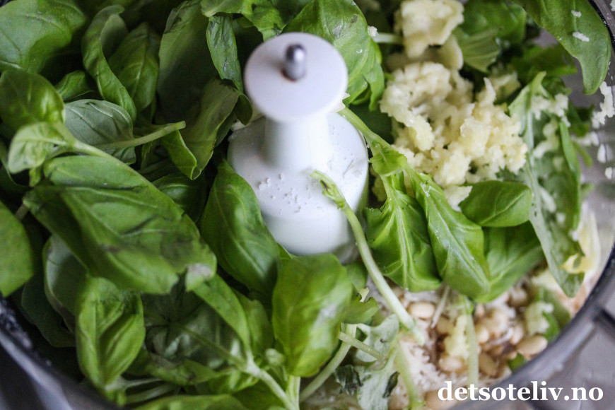 Ha den revne parmesanosten, basilikumblader (og -stilker) og pinjekjerner i en food processor. Press hvitløken med hvitløkspresse og ha i.