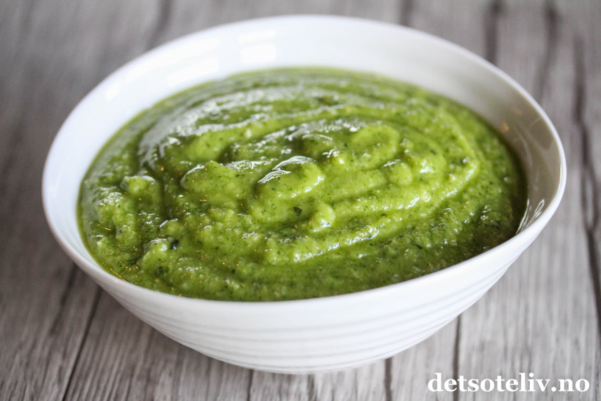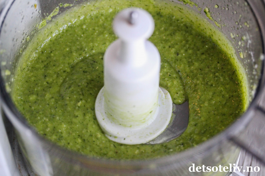 Kjør blandingen sammen til en kornete masse. Tilsett olivenolje og kjør blandingen videre til alt blir most fint sammen. Smak til med presset sitronsaft og maldonsalt.