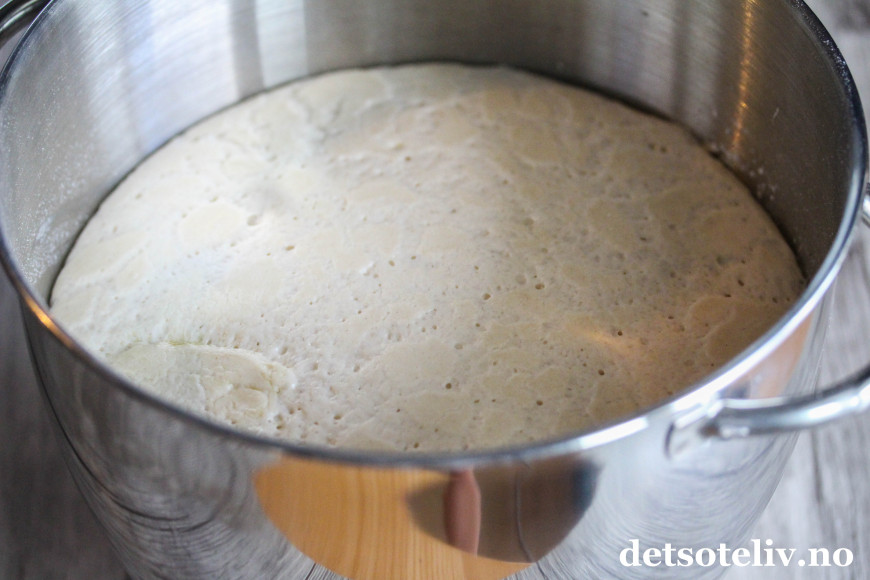 ♥ Merk at denne deigen skal være løs og klissete. Den kan ikke eltes på bakebordet, og skal altså bare helles ned i langpannen direkte fra bakebollen. Med olivenolje på fingrene, går det likevel fint å dra deigen utover i langpannen.